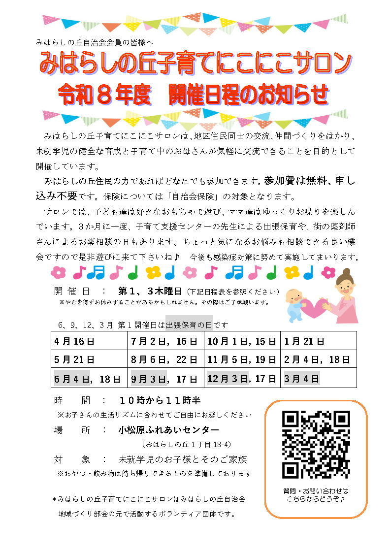 令和8年4月~令和9年3月まで にこにこサロン開催予定表 2026年3月9日 edit_00 みはらしの丘子育てにこにこサロン令和8年度の開催日程です。スタッフ一同いつも楽しんでいただけるよう準備していますので、是非遊びに来てください。 お知らせ 子育てサロン