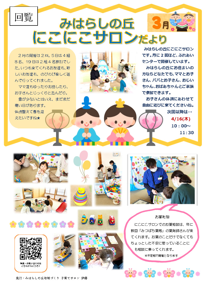 みはらしの丘にこにこサロンだより 2月号 2026年2月1日 edit_00 サロンだより2月号です。今が一番寒い時期ですが、多くの方からお越しいただきました。室内は暖かいので遊びに来てくださいね。 子育てサロン